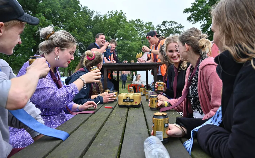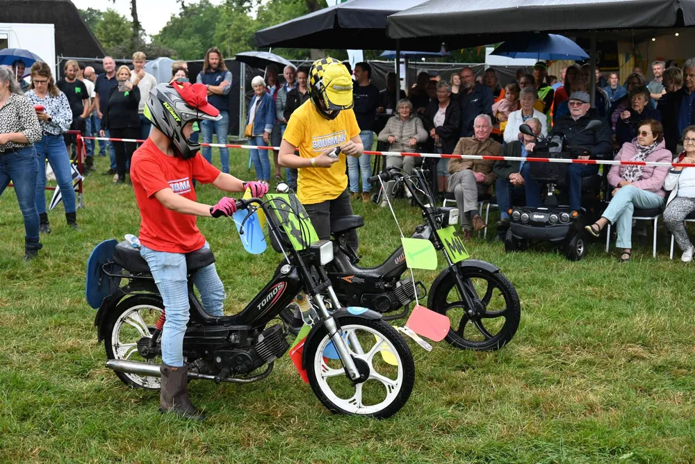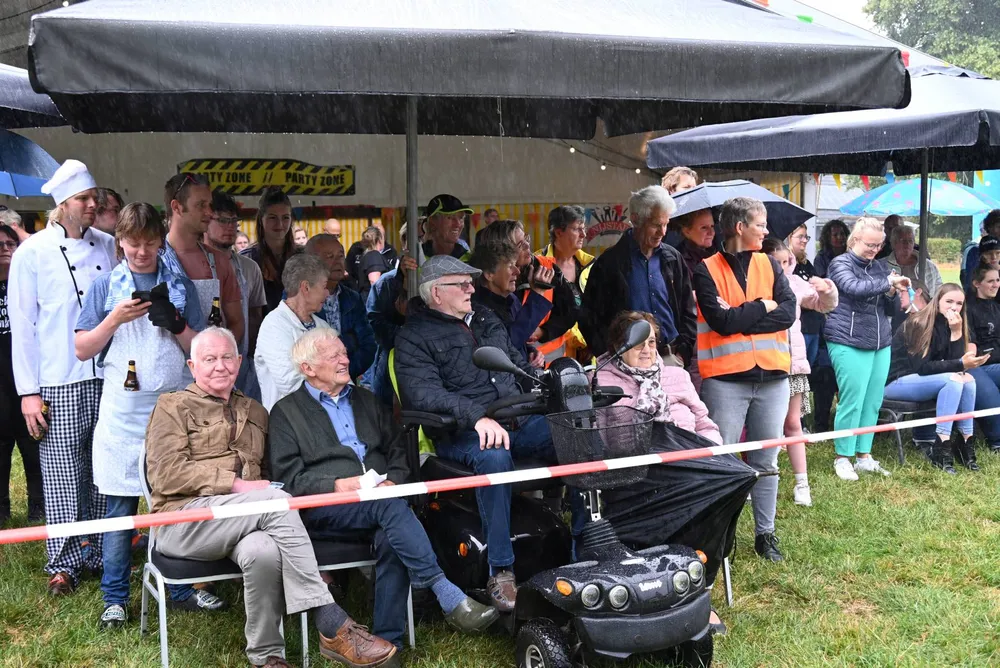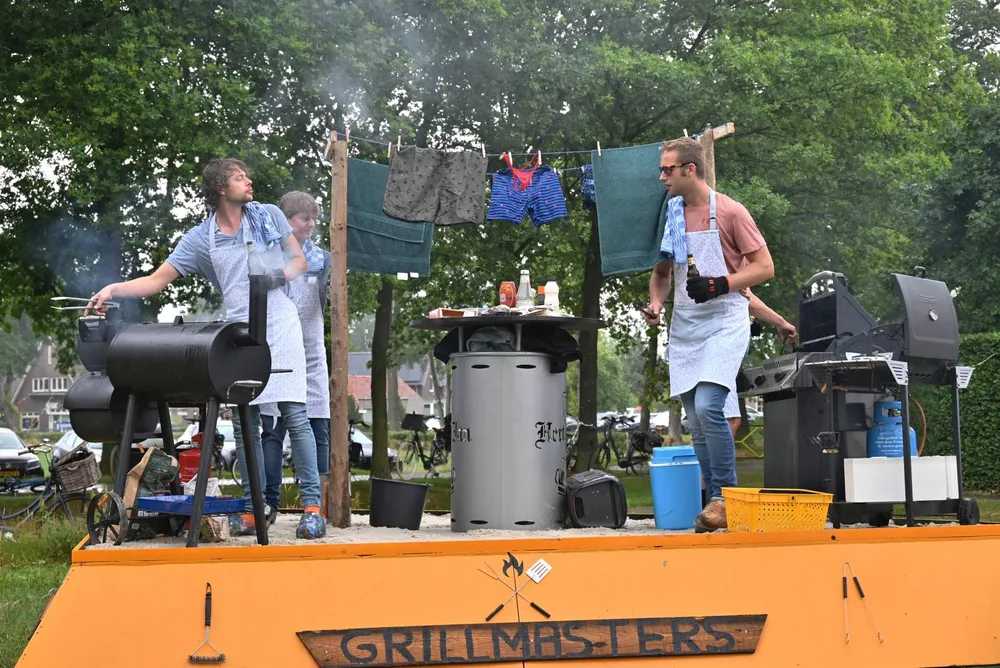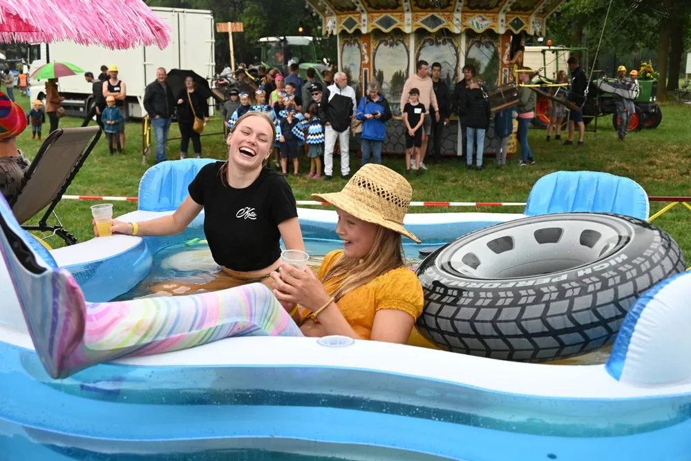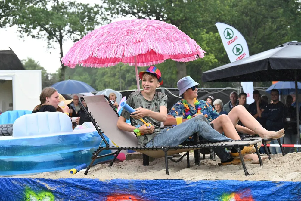 De organisatie dacht dat ze de grote bui met uitstel van een half uurtje konden omzeilen, maar Pluvius is onberekenbaar, Buienradar onbetrouwbaar en Bacchus alom aanwezig. Nat werd het dus sowieso, al maakte dat voor een aantal deelnemers niets uit: er zaten jongedames in een opblaasbaar badje, er werd flink met waterpistolen geschoten en er werd de nodige andere nattigheid ingenomen.
