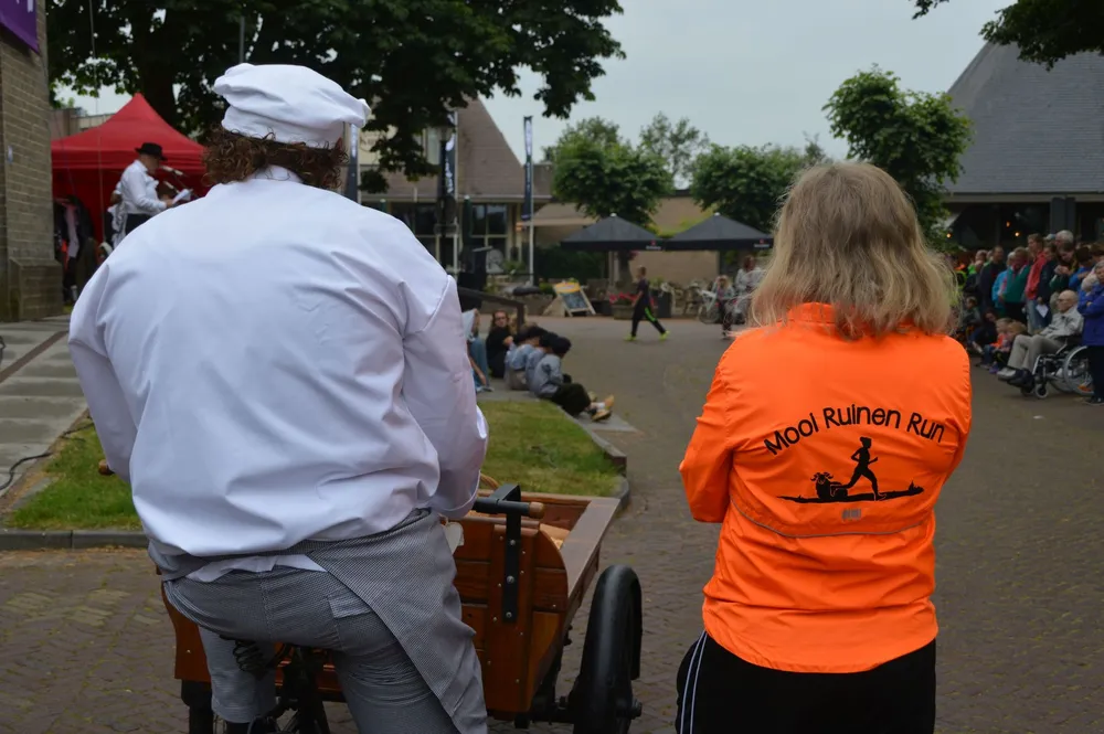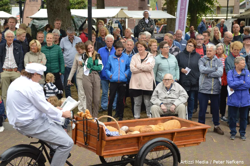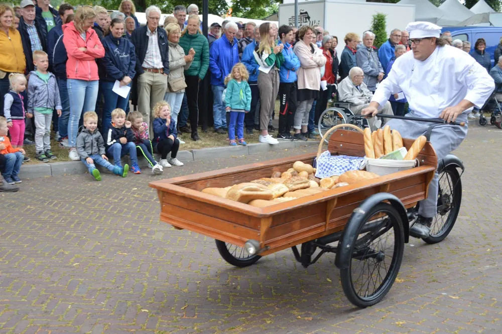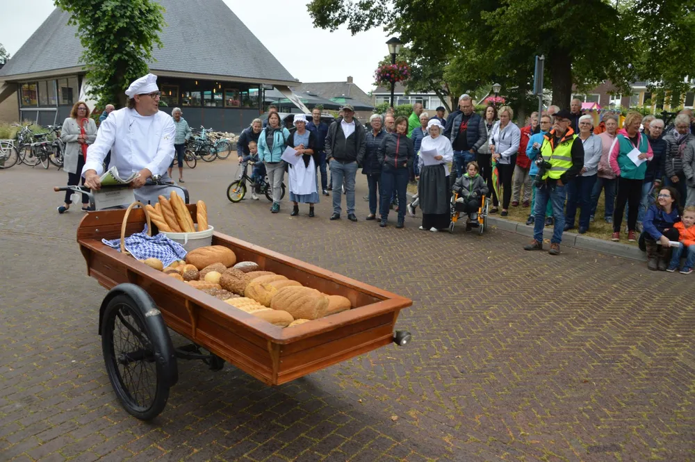 Ruinen - Bakker Dekker heeft vanavond zijn intrede gedaan in Ruinen. Tijdens de eerste woensdag van het Brinkfestijn kwam hij rond kwart voor zeven met een bakfiets vol vers brood om het publiek te trakteren op zijn (fantasie?)verhalen.