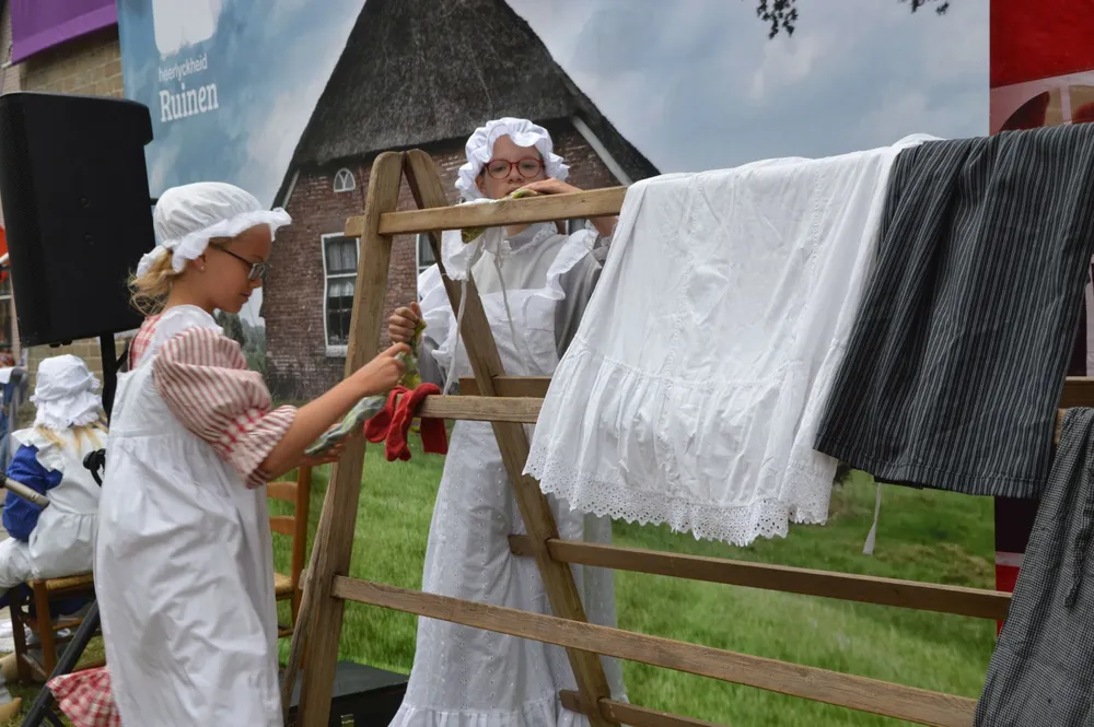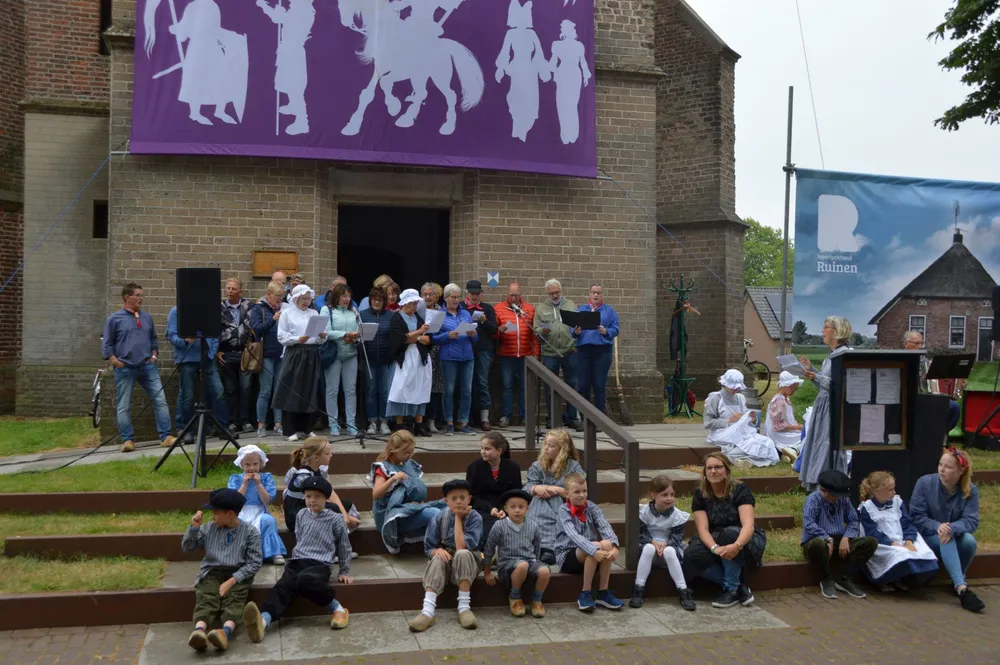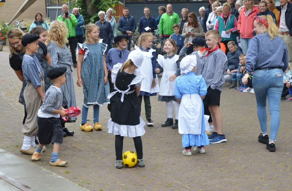 Die schat is het thema van de theaterreeks, die elke woensdag om 18.30 uur voor de Mariakerk wordt opgevoerd. Ook aanwezig de kinderen in historische kledij, die dit keer zakdoekje leggen speelden, en het Brinkkoor, dat het slotlied zingt.