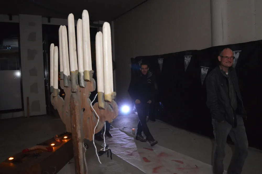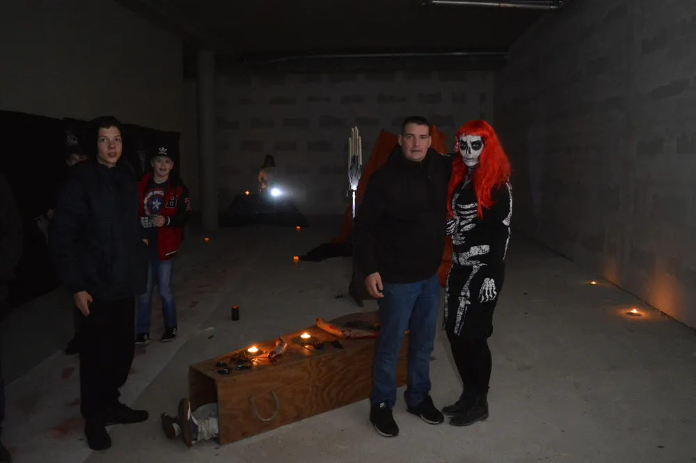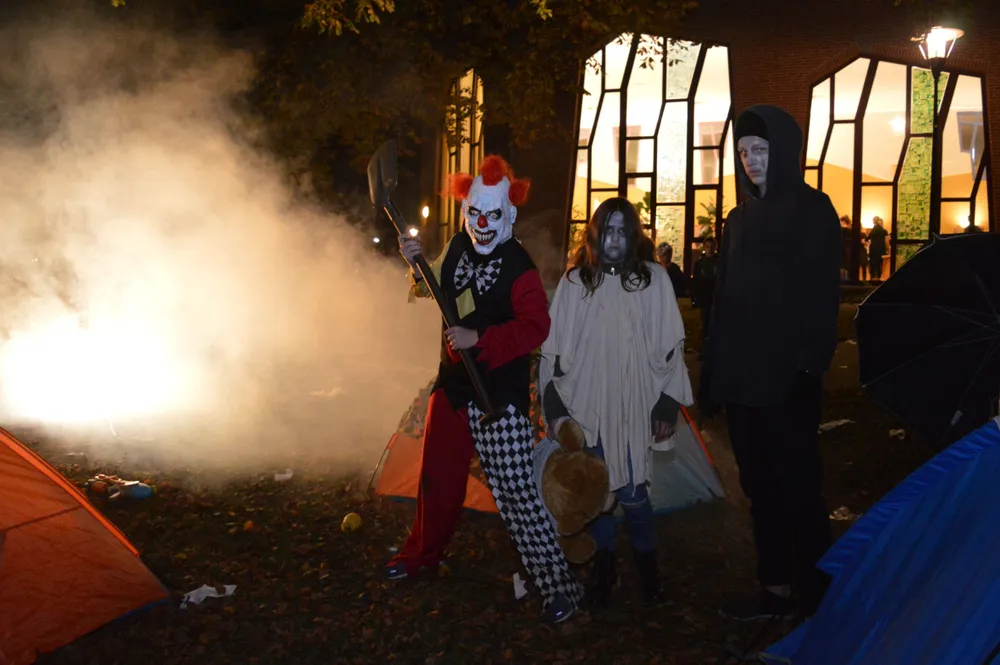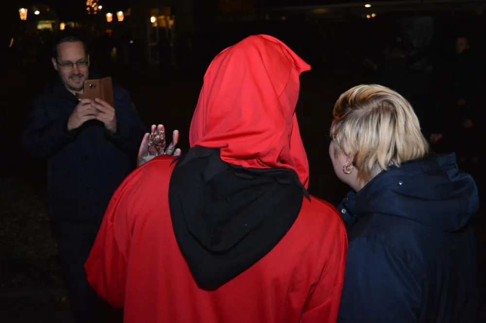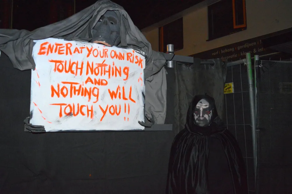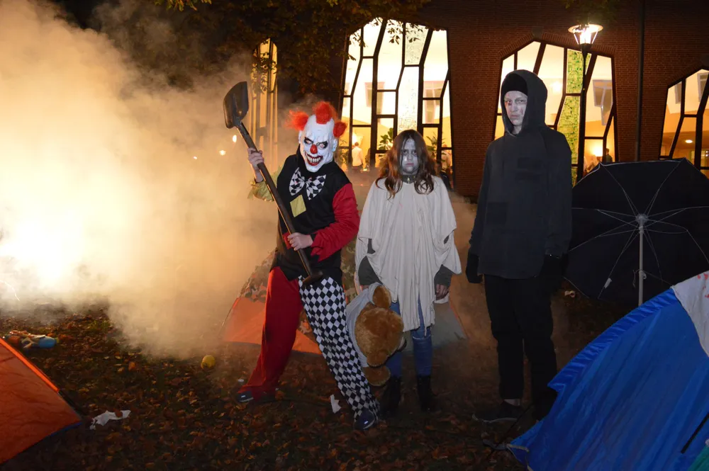 Er was ook en rustpunt en dat was de hervormde kerk, waar de gezamenlijke kerken van Zuidwolde het licht hadden ontstoken voor wie maar wilde. Er was snoep voor de kinderen, koffie en thee, maar ook pompoensoep. Dat was dan ook de enige verwijzing naar Halloween. Bijzonder was ook dat er in de raadszaal van het gemeentehuis een trouwerij aan de gang was, terwijl op het grasveld daarvoor een horrorclown, eng meisje en een man met schep in een tentenkamp vol rook voor angstwekkende taferelen zorgden.