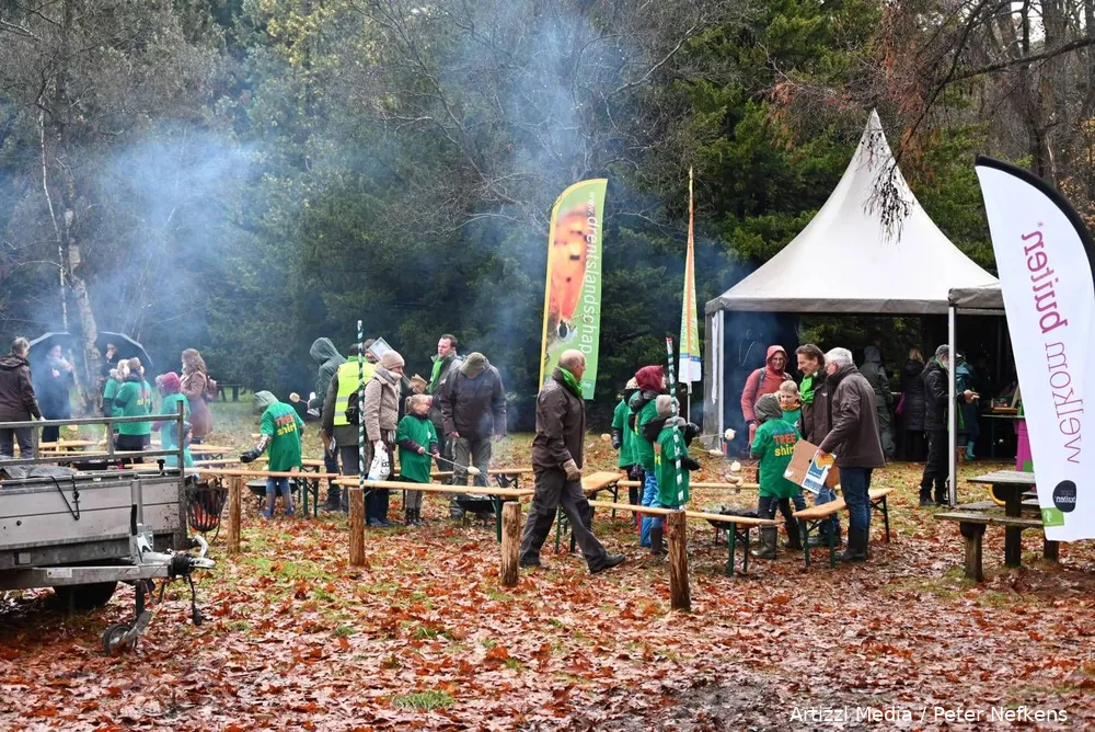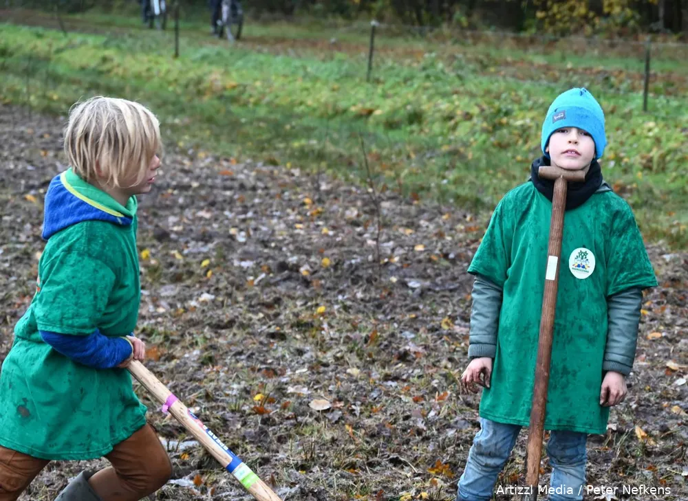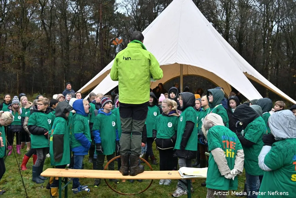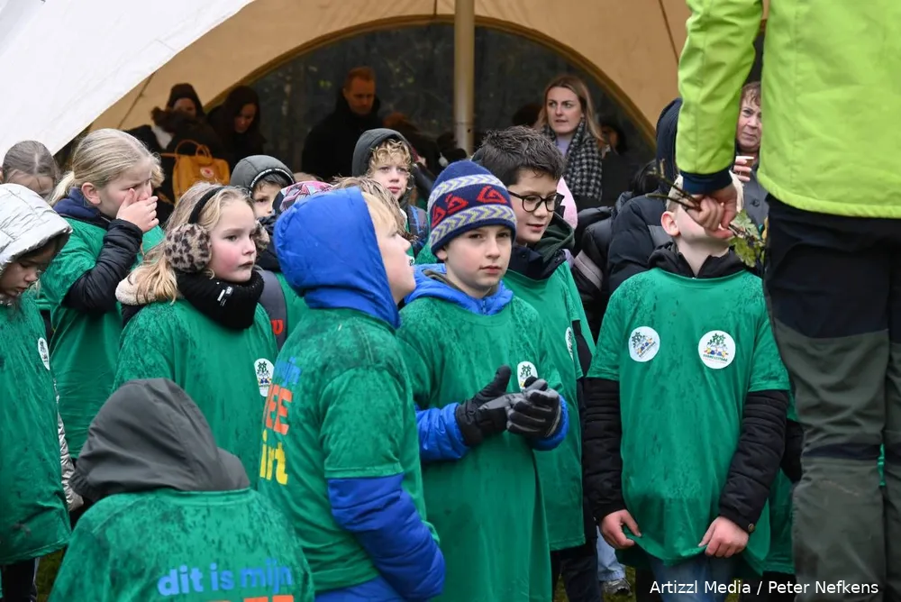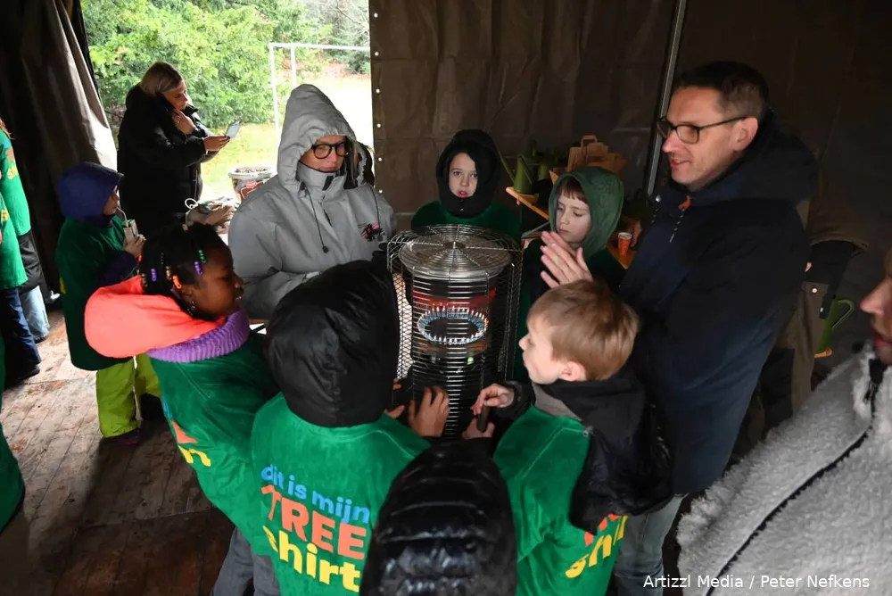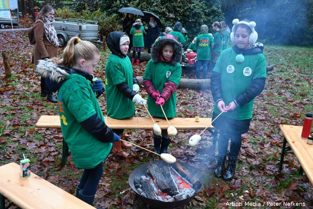 Voor de kinderen was er een heel programma samengesteld met vier workshops en verschillende leuke onderdelen, als broodbakken boven een knapperend vuurtje. Dat laatste gaf ook direct wat extra warmte, want frisjes was het zeker. De workshops waren spelenderwijs opgezet en de schooljeugd trok in een carrousel door het bos, zo rond half twaalf was het officiële boomplantmoment. Daarbij waren ook de genodigden aanwezig, zoals televisiepersoonlijkheid Albert Verlinde die voorzitter is van de stichting Nationale Boomfeestdag.