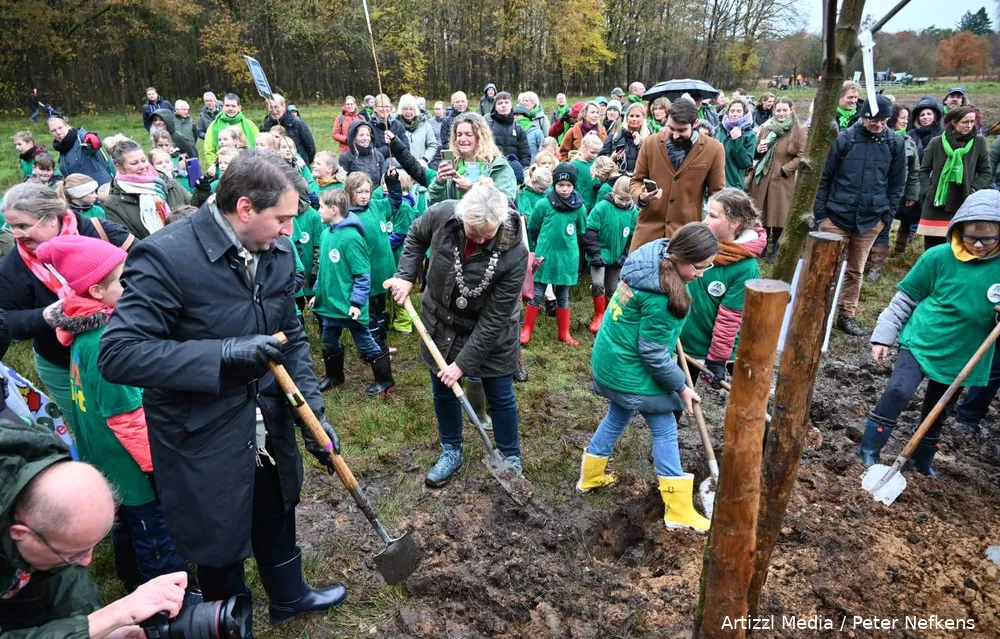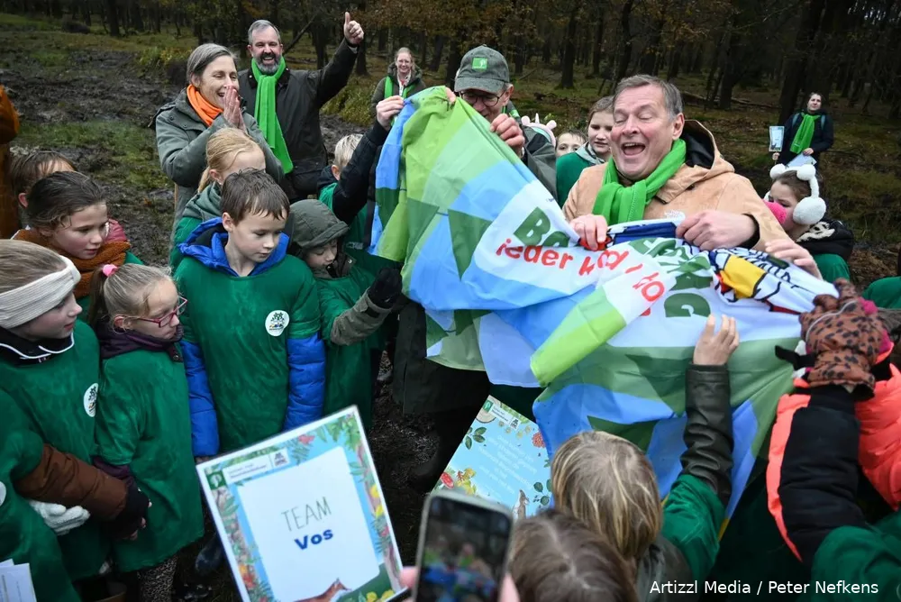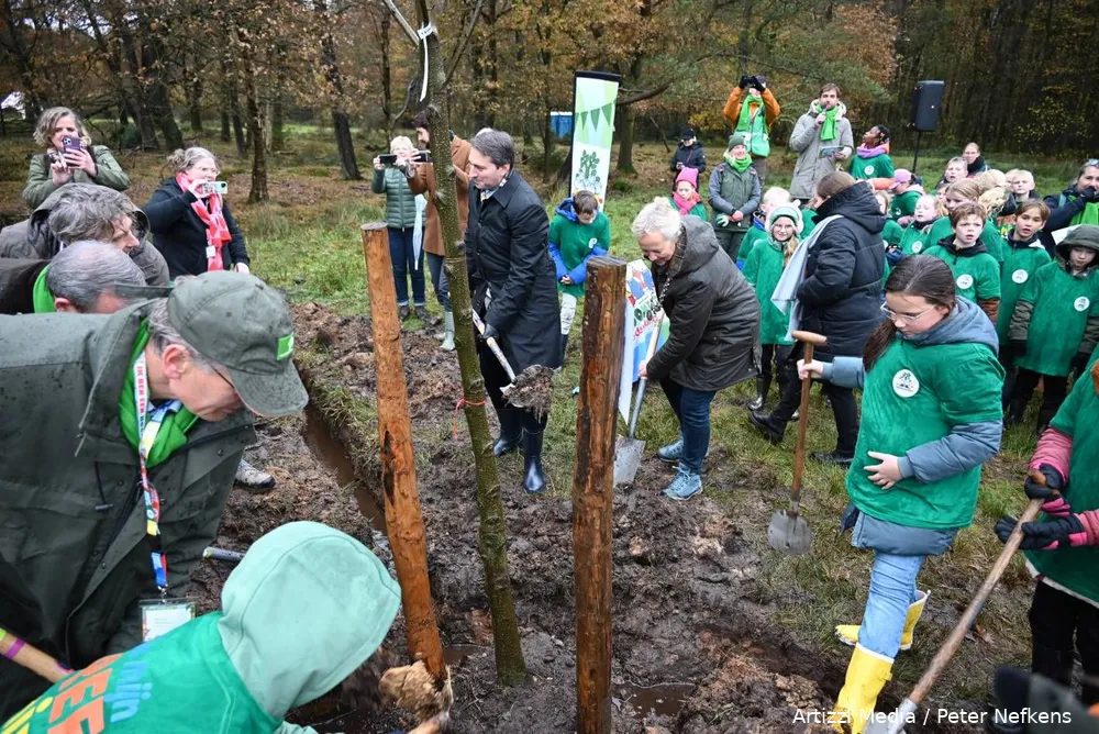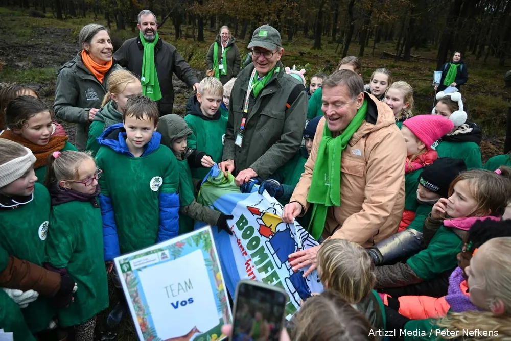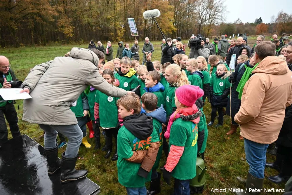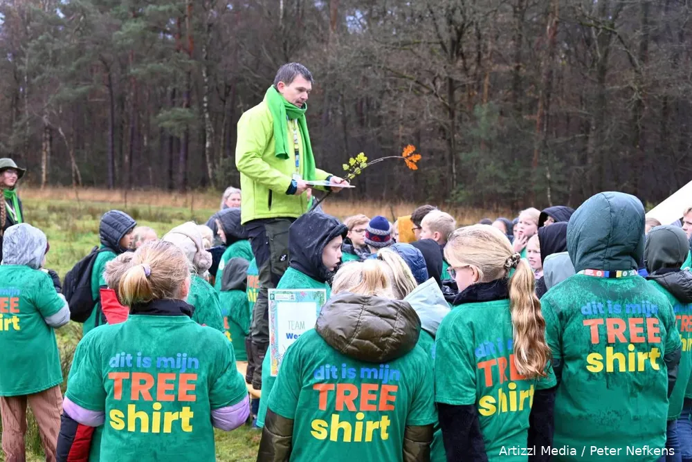 Voor de kinderen was er een heel programma samengesteld met vier workshops en verschillende leuke onderdelen, als broodbakken boven een knapperend vuurtje. Dat laatste gaf ook direct wat extra warmte, want frisjes was het zeker. De workshops waren spelenderwijs opgezet en de schooljeugd trok in een carrousel door het bos, zo rond half twaalf was het officiële boomplantmoment. Daarbij waren ook de genodigden aanwezig, zoals televisiepersoonlijkheid Albert Verlinde die voorzitter is van de stichting Nationale Boomfeestdag.