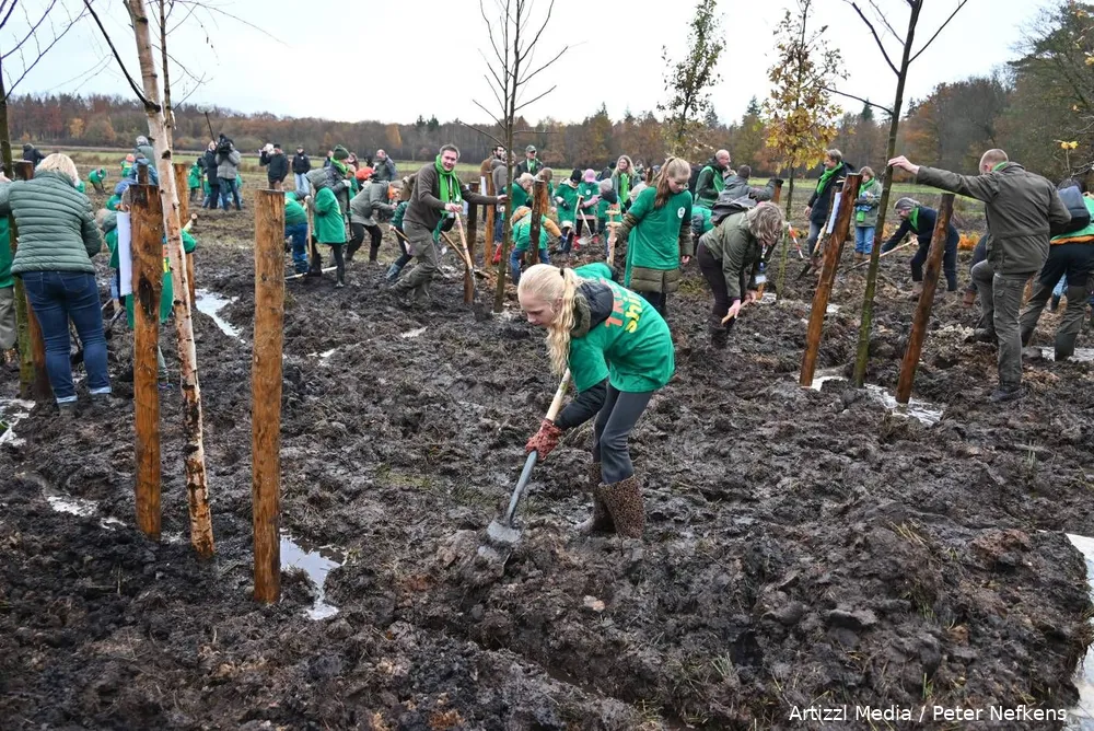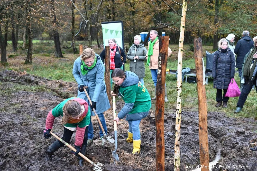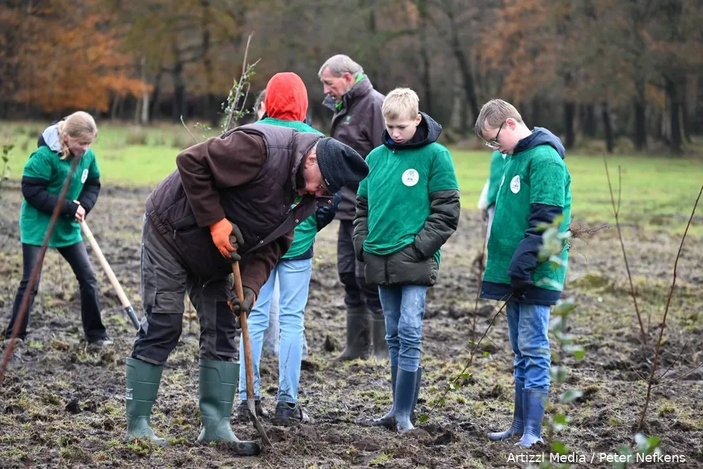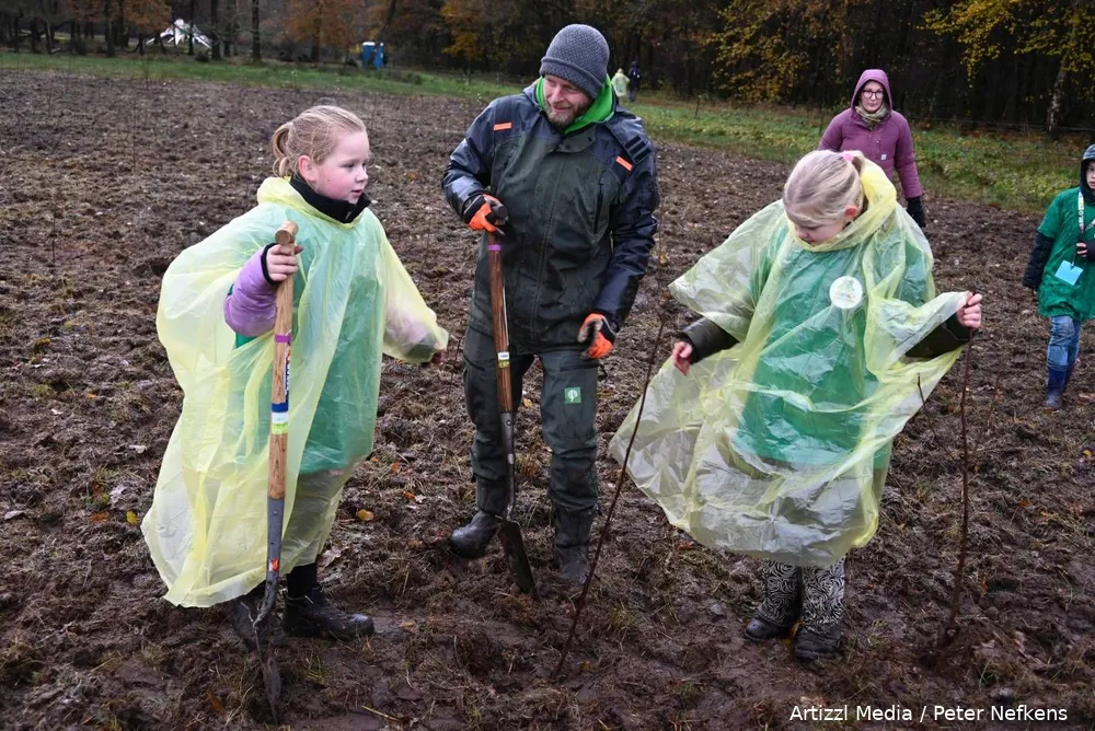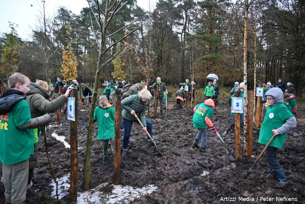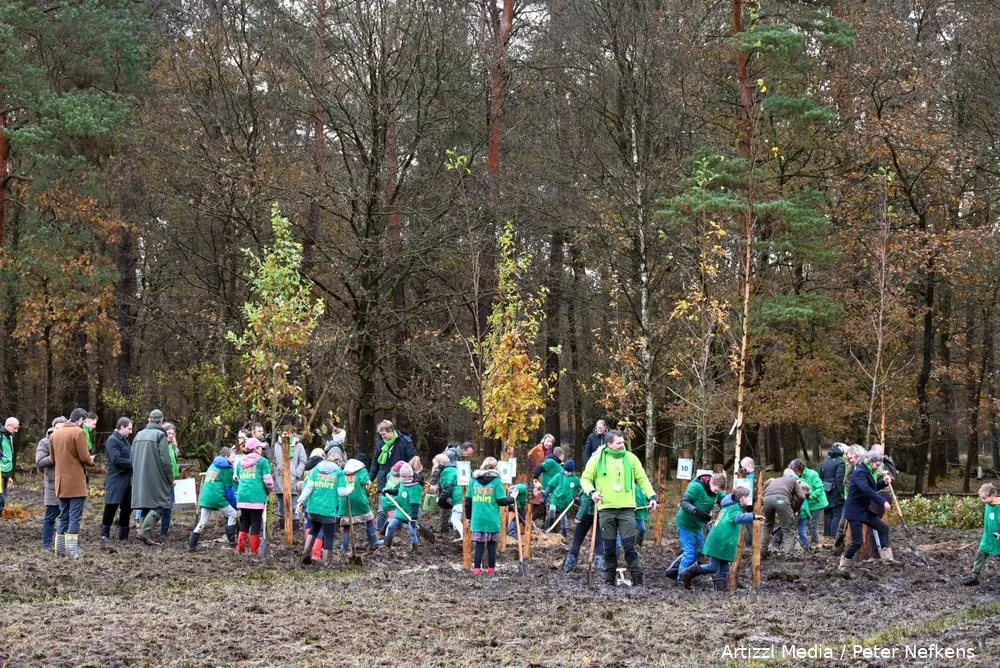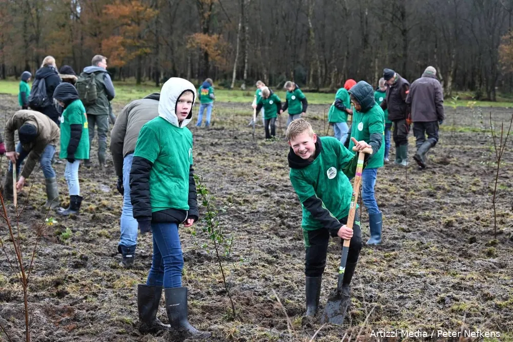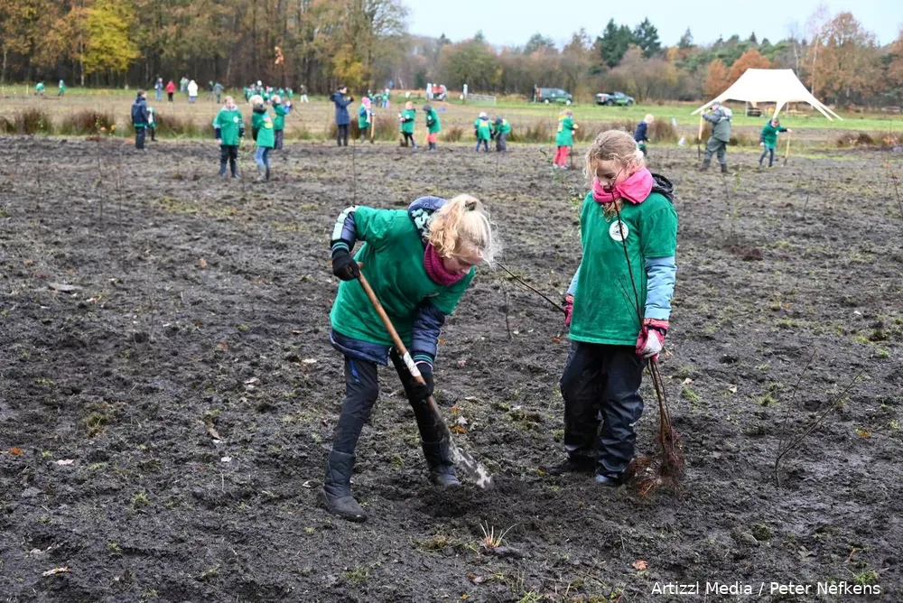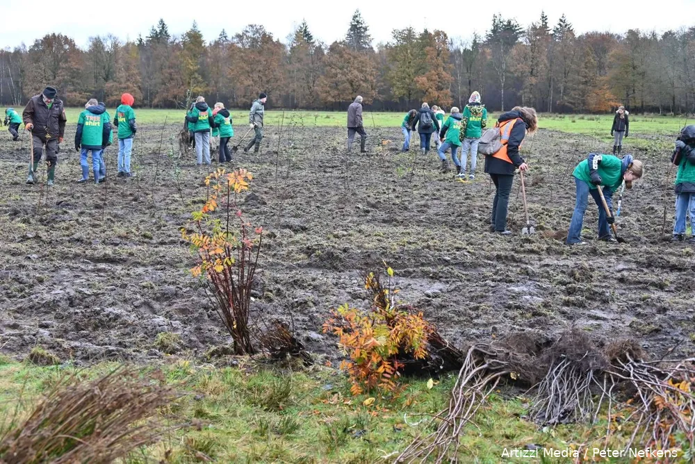 Echten/Ruinen - Er werden woensdag liefst 1500 struiken en bomen geplant op een open terrein van Staatsbosbeheer achter Het Bovenveen in de Boswachterij Ruinen. Driehonderd kinderen en tachtig vrijwilligers moesten zich op deze Nationale Boomfeestdag af en toe een weg door de modder en plassen banen om op de plaats van bestemming te komen.
