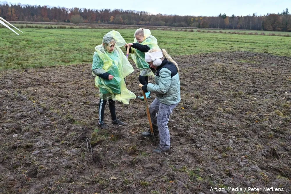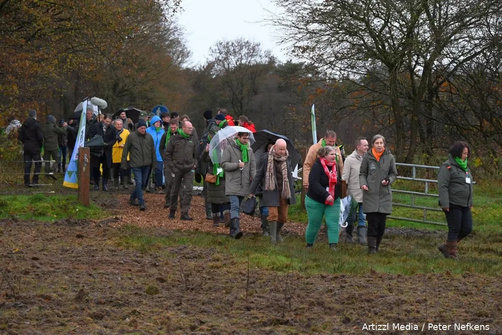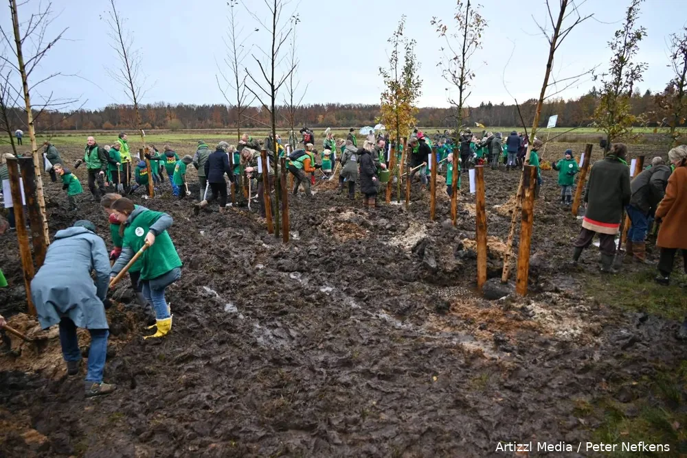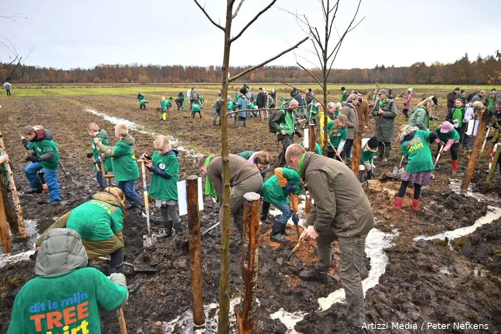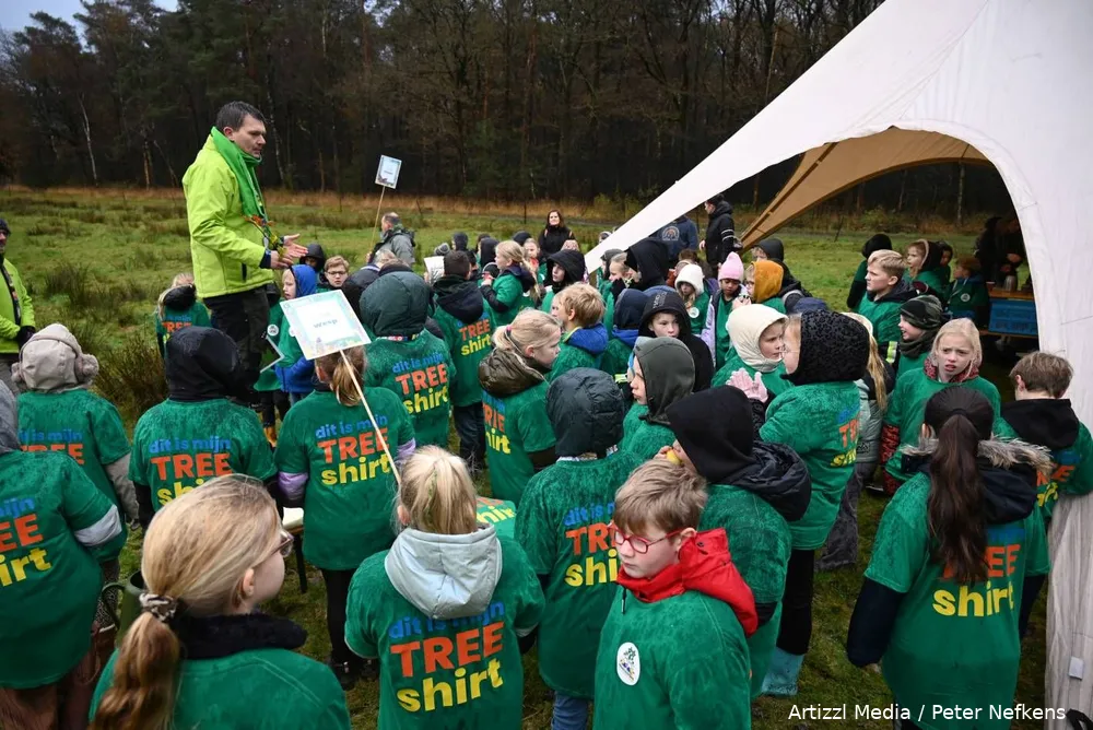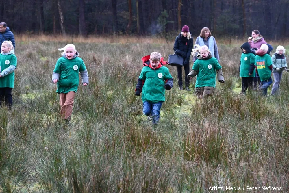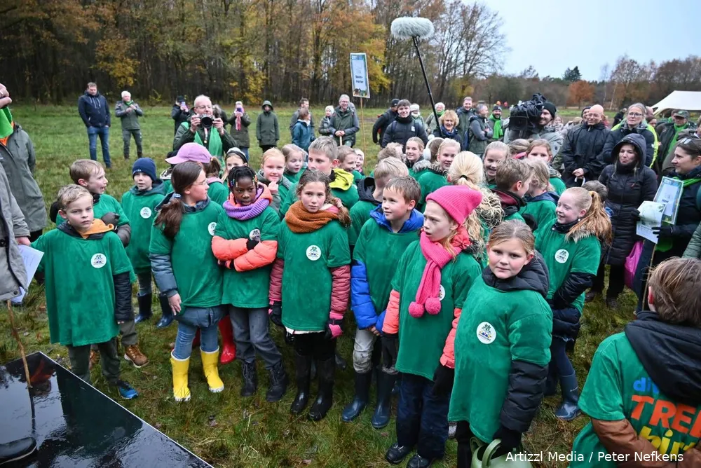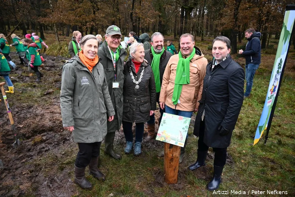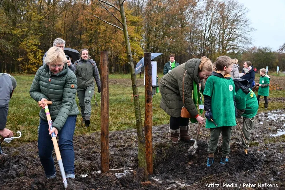 Echten/Ruinen - Er werden woensdag liefst 1500 struiken en bomen geplant op een open terrein van Staatsbosbeheer achter Het Bovenveen in de Boswachterij Ruinen. Driehonderd kinderen en tachtig vrijwilligers moesten zich op deze Nationale Boomfeestdag af en toe een weg door de modder en plassen banen om op de plaats van bestemming te komen.